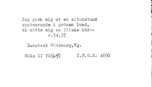//// Jag gick mig ut en aftonstund //// spatserande i grönan lund, //// då mötte mig en flicka kär— //// s.34,35 ! //// Danstext Göteborg,Vg. //// Nääs II 70I.F.G.H. 4650 //// - ////