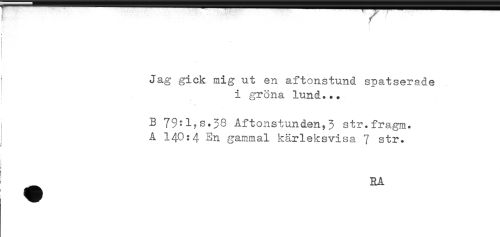 //// } //// Jag gick mig ut en aftonstund spatserade //// i gröna lund... //// B 79:l,s.38 Aftonstunden,3 str.fragm. //// A 140:4 En gammal kårleksvisa 7 str. //// i //// ____RA ////