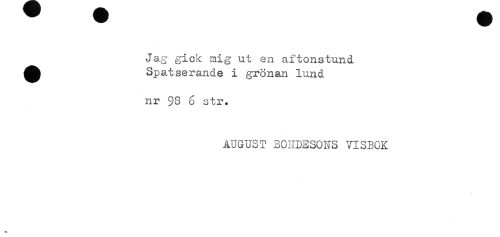 //// Jag gick mig ut en aftonstund. //// ^ Spatserande i grönan lund //// nr 98 6 str. //// AUGUST BONDESONS VISBOK ////