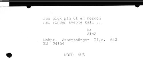 //// Jag gick mig ut en. morgon //// när vinden svepte kall ... //// Me //// Alnö //// Mskpt* Arbetssånger II,s. 643 //// EU ^ 24154 //// NORD MUS ////