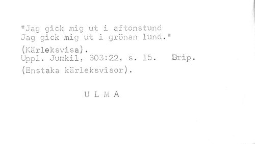 //// "Jao qick mig ui i aftonstund //// Jag gick mig ut i grönan lund.'' //// (Kärleksvisa). //// Uppl. Jumkil, 303:22, s. 15. Orip. //// (Enstaka kärleksvisor). //// U L M A ////