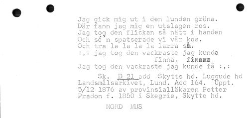 //// ^^ Jao qick miq ut i den lunden gröna. //// Där fann jag mig en utslagen ros. //// Jag to^ den flickan så nätt i handen //// Och se n spatserade vi vår kos. //// Och tra la la la la larra sm. //// :.: jag tog den vackraste jag kunde //// finna. xiKRM //// Jag tog den vackraste jag kunde få //// Sk. D 21 add Skytts hd. Luggude hd //// Land små1s ark ive t, Lund. Acc 164. Uppt. //// 5/12 1876 av provinsialläkaren Petter //// Pradon f. 1850 i Skegrie, Skytte hd. ////