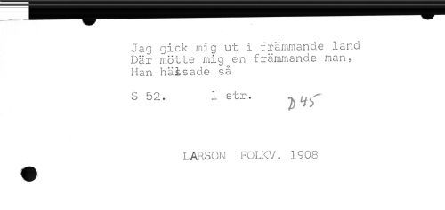 //// Jag gick mig ut i främmande land //// Där mötte mig en främmande man, //// Han häisade så //// S 52. 1 str. ^ ^^ //// LARSON FOLKV. 1908 ////