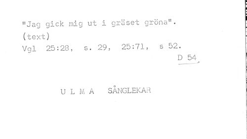 //// "Jag gick mig ut i grkset gröna", //// (text) //// Vgl 25:23, s. 29, 25:71, s 52. //// D 54 //// _______ //// U L M A SÅNGLEKA i ////