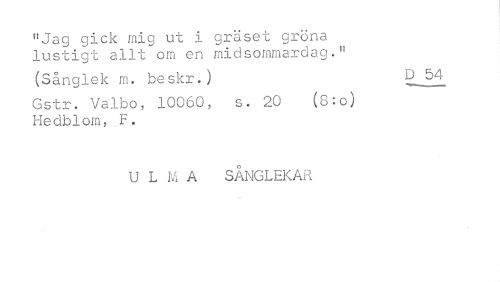 //// "Jac nick mig ut i gräset grena //// lustige allt cn en niesommarceg." //// (Sång.-, ek r . be skr. ) D__54 //// Gstr. Vi. i lo, 10000, s. 20 (8:e) //// Hedblom, i . //// U L j., A SÅNGLEKAt: ////