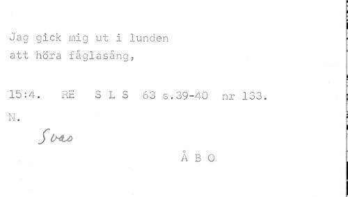 //// Jag gick mig ut i lunden //// att höra fåglasång, //// 15:.a. RE SLS 63 s.39-40 nr 133. //// ; :. ////