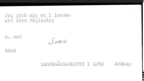 //// Jag gick mig ut i lunden ] //// att höra fåglasång j //// m. not j //// J^^O ] //// 5660 //// LANDSMÅLSAPXIVET I LUND SVAKop ////