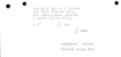 //// ^^ Jag gick mig ut i lunden //// att höra fåglars sång. //// Der näktergalen spelade //// i denna ljufva klang //// s 47 13 str //// LASENIUS' VISBOK //// FINLAND kopia SVA ////