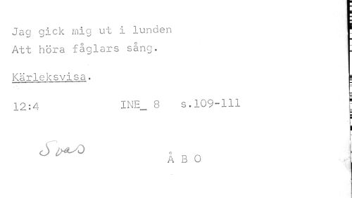 //// Jag gick mig ut i lunden. ' //// Att höra fåglars sång. ; //// Karlek s v i s a . ; //// 12:4 8 s.109-111 //// H //// H //// i //// AB O i ////