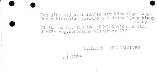 //// ' Jag gick mig ut i lunden att höra fågelsång, //// Hur naktergalen spelade p å denna ljuva //// ^ klang //// 11:10 nr 63, sid.144, Kärleksvisa, 2 str. //// ' J mför Aug.Bondesons Visbok nr 177 //// ! //// OORSLUilj OiED DÅLÄLVH*: //// * ////