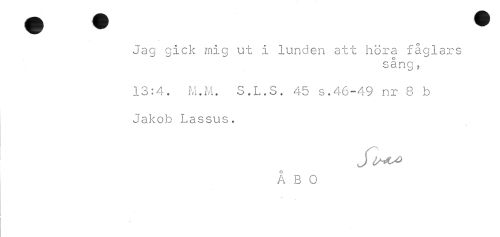 //// Jag gick mig ut i lunden att hora fåglars //// sång? //// 13:4. M.M. S.L.S. 45 s.46-49 nr 8 b //// Jakob Lassus. //// J //// o //// B 0 ////