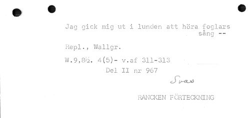 //// Jag gick mig ut i lunden att höra foglars //// sång -- //// Repl.; Wallar. //// W.9,&a. (U- v. af 311-313 //// Dol II nr 967 //// ;l'JllaEN 1 ORTE( 111111 ////