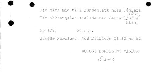 //// Jag gick mig ut i lunden,att höra fåglars //// sång, //// Där näktergalen spelade med denna ljufva //// klana //// Nr 177, IM str. //// Jrinfor rcrslunt. nod Daldlrnn llrlO nr oo //// ^drddi ddrrnoirs vi^nii: ////