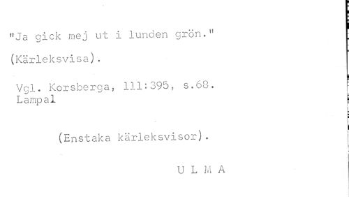 //// "Ja oick mej ut i lunden grön." ; //// (Kärleksvisa). //// ] //// Vgl. Korsberga, 111:395, s.68. //// Lampal //// (Enstaka kärleksvisor). //// U L M A ////