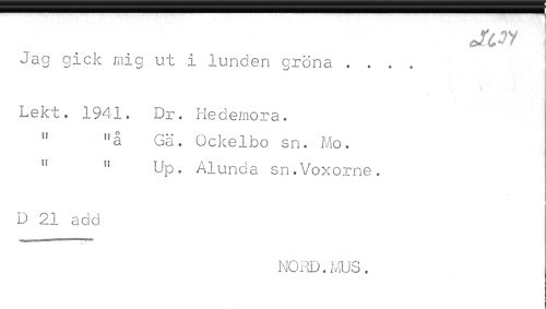 //// Jag gick mig ut i lunden gröna .... //// Lekt. 1941. Dr. Lademora. //// " "å Gl. uckelbo sn. Mo. //// " " Up. Alunca an.Vexeaaae. //// D 2.1. aa! //// r2.,;:D.;,t.g. ////