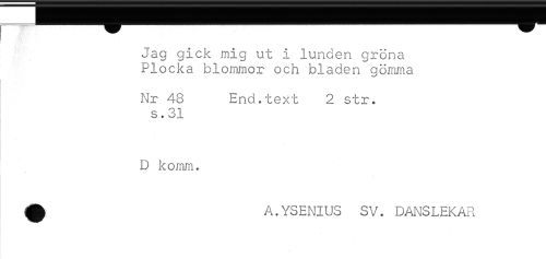 //// Jag gick mig ut i lunden gröna //// Plocka blommor och bladen gömma //// Nr 48 End.text 2 str. //// s. 31 //// D komm, //// * //// ^ A.YSENIUS SV. DANSLEKAR ////