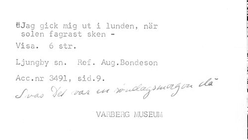 //// MJag gick mig ut i lunden, när ^ //// solen fagrast sken - : //// Visa. 6 str. //// a //// 5 //// Ljungby sn. Ref. Aug.Bondeson [ //// Acc.nr 3491. sid.9. - ^ //// ^ ^ ^^^ I/ //// VA.2JH.K iviUSEUM ////