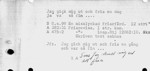 //// Jacj gick mig ut och fria en dag //// ja va' så fin .... //// i'.' '. . . '("..-'-'./i-t'';'.'. ' _ //// B S.s.98 En misslyckad friarfärd. 12 str: //// A 382:31 Friarevisa^ 1 str. kom. //// A 475:2 insp.Rtj 12062:10. Sk //// Skriven text saknas //// * //// \Jfr. Jag gick mig ut och fria en gang //// och var så fin ... , ////