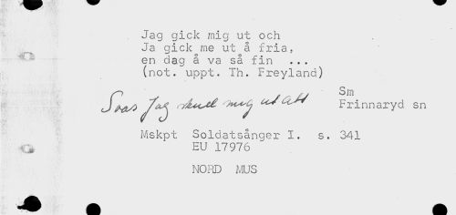//// Jag gick mig ut och //// Ja gick me ut å fria. //// en dag å va så fin //// (not. uppt. Ih. Freyland) //// J^^^/^ Frinnaryd sn //// Mskpt Soldatsånger 1. s. 341 //// EU 17976 //// NORD MUS ////