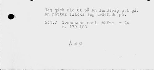 //// Jag gick mig ut på en landsväg att gå, //// en nätter flicka jag träffade på. //// 6:4.? Svenssons saml. häfte r 24 //// s. 179-180 //// i //// ÅBO ////