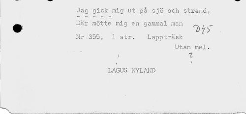 //// Jag gick mig ut på sjö och strand, //// ^^ Dar mötte mig en gammal man ^ , _ //// Nr 355, 1 str. Lappträsk //// ! //// ! Utan mel. //// / 1 //// LAGUS NYLAND //// i //// . . .. ___ . . . ............. < ^ ....... . . -v. .-.-t — . i-- .. . ____—___- . . - -<-—.,___. ^ ______ .r————-.. —- . ... . — . ! . * ////