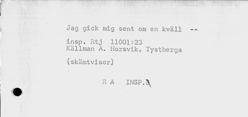 //// Jag gick mig sent om en kväll -- //// insp. Rtj 11001:23 //// Källman A. Horsvik, Tystberga //// (skämtvisor) //// R A INSP.^ ////
