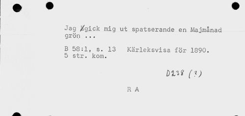 //// nHHHh* i]]]])? //// Jag Xgick mig ut spatserande en Majmånad //// grön ... //// B 58:1, s. 13 Kärleksvisa för 1890. //// 5 str. kom. //// R A ////