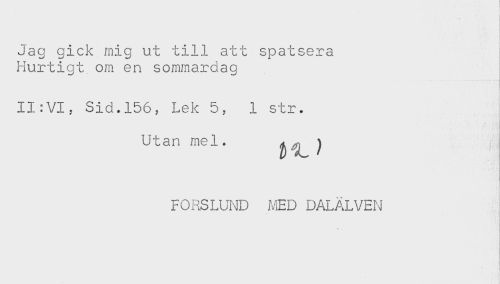 //// Jag gick mig ut till att spatsera //// Hurtigt, om en sommardag //// II:VI, Sid.156, Lek 5, 1 str. //// Utan mel. ^ ^ //// FORSLUND MED DALÄLVEN ////