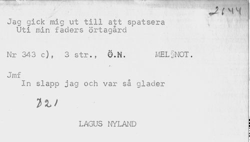 //// Jag gick mig ut till att spatsera //// Uti min faders örtagård //// Nr 343 c), 3 str., O.N. MEL§NOT. //// Jmf //// In slapp jag och var så gläder //// LAGUS NYLAND ////