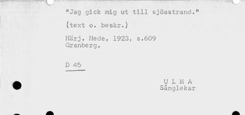 //// "Jag gick mig ut till sjöastrand." //// (text o. beskr.) //// Härj. Hede, 1923, s.609 //// Granberg, //// D 45 //// ^ U L M A //// * Sånglekar ////