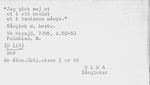 //// "Jag gick mej ut //// ut i ett beslut //// ut i tankarna många." //// Sånglek m. beskr. //// Vb Norsjö, 7395, s.52-53 //// Palmblad, W. //// (D 114) //// 269 //// Se Säve,Gotl.visor I nr 68 ////