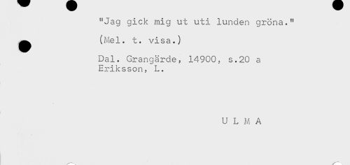 //// "Jag gick mig ut uti lunden gröna." //// ^ (Mel. t. visa.) //// Dal. Grangärde, 14900, s.20 a //// Eriksson, L. //// U L M A ////