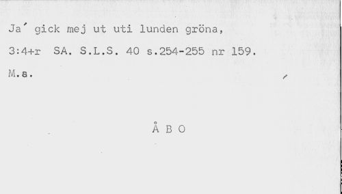 //// Ja' gick mej ut uti lunden gröna, //// 3:4+r SA. S.L.S. 40 s.254-255 nr 159. //// M.a. ^ //// ÅBO ////