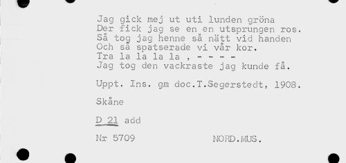 //// Jag gick mej ut uti lunden gröna //// Der fick jag se en en utsprungen ros. //// Så tog jag henne så nätt vid handen //// Och sa spatserade vi vår kor. //// Tra la la la la , - - - - //// Jag tog den vackraste jag kunde få. //// Uppt. Ins. gm doc.I.Segerstedt, 1908. //// Skåne //// D,21 add //// Nr 5709 NORD.MUS. ////