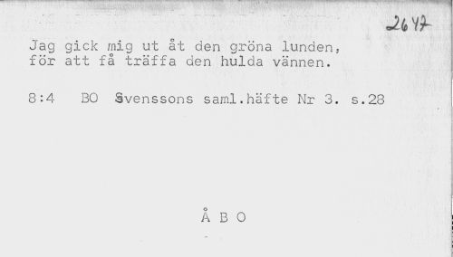 //// Jag gick mig ut åt den gröna lunden, //// för att få träffa den hulda vännen. //// 8:4 BO Svenssons saml.häfte Nr 3. s.28 //// * ////