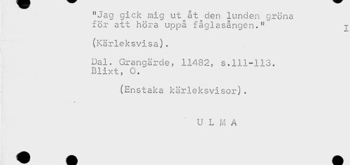 //// "Jag gick mig ut åt den lunden gröna //// för att höra uppå fåglasången." //// (Kärleksvisa). //// i //// Dal. Grangärde, 11482, s.111-113. //// Blixt, O. //// (Enstaka kärleksvisor). //// U L M A ////