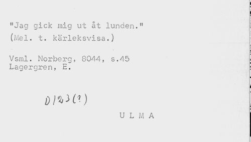 //// ! //// "Jag gick mig ut åt lunden." //// (Mel. t. kärleksvisa.) //// Vsml. Norberg, 8044, s.45 ; //// Lagergren, E. : //// < //// ) ////