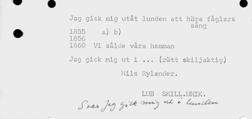 //// Jag gick mig utåt lunden att höra fåglars //// sång //// ^ 1855 a) b) //// ^ 1856 //// 1860 Vi sålde våra hemman //// Jag gick mig ut i ... (rätt skiljaktig) //// Nils Rylander. ////