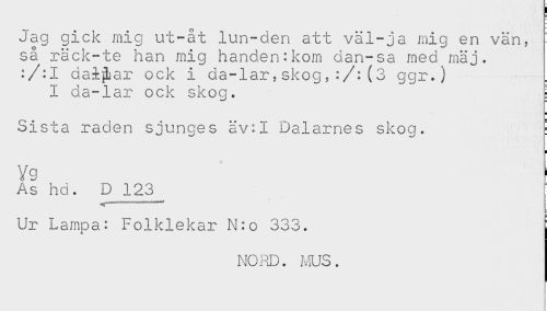 //// Jag gick mig ut-åt lun-den att väl-ja mig en vän? - //// så räck-te han mig handen:kom dan-sa med mäj. //// :/:I aai^ar ock i da-lar?skog?:/:(3 ggr.) //// I da-lar ock skog. ! //// i //// Sista raden sjunges äv:I Dalarnes skog. ! //// Vg //// As hd. D 123 //// -<-- //// Ur Lampa: Folklekar N:o 333. //// NORD. J.1US. ////