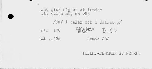 //// Jag gick mig ut åt lunden //// ^^ att välja mig en vän //// /jmf.I dalar och i dalaskoa/ //// n:r 130 ^^^ Dj^ //// II s.426 Lampa 333 //// TILLH.-DENCKER SV.FOLKL. ////