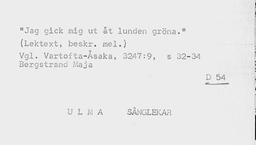 //// "Jag gick mig ut åt lunden gröna." //// (Lektext, beskr. mel.) //// Vgl. Vartofta-Asaka, 3247:9, s 32-34 //// Bergstrand Maja //// D 54_ //// ! //// U L M A SÅNGLEKAR ////