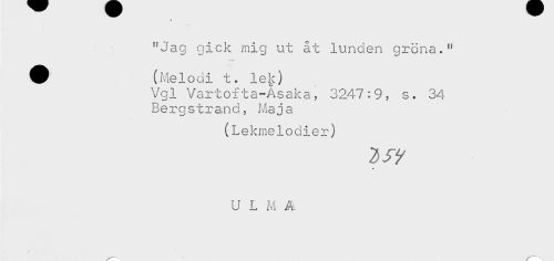 //// "Jag gick mig ut åt lunden gröna." //// -*—% //// ^ (Melodi t. lek) //// Vgl Vartofta-Asaka, 3247:9, s. 34 //// B e rg s t r an d, Maj a //// (Lekmelodier) //// U L M A ////