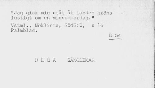 //// "Jag gick mig utåt åt lunden gröna ' - //// lustigt om en midsommardag." //// Vstml., Möklinta, 2542:3, s 16 //// Palmblad. //// U L M A SÅNGLEKAR ////