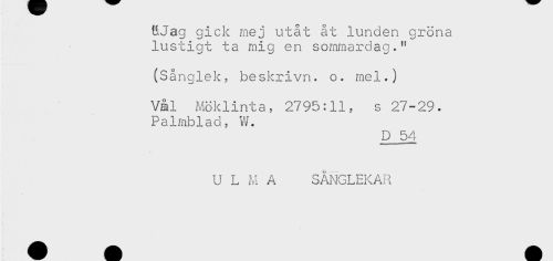 //// tUag gick mej utåt åt lunden gröna //// lustigt ta mig en sommardag." //// (Sånglek, beskrivn. o. mel.) //// Vål Möklinta, 2795:11, s 27-29. //// Palmblad, W. //// D 54 //// U L M A SÅNGLEKAR ////
