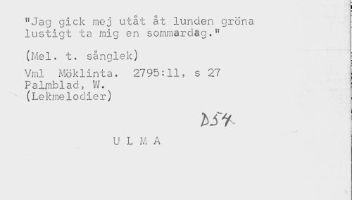 //// "Jag gick mej utåt åt lunden gröna //// lustigt ta mig en sommardag." //// (Mel. t. sånglek) //// Vml Möklinta. 2795:11, s 27 //// Palmblad, W. //// (Lekmelodier) //// U L M A ////