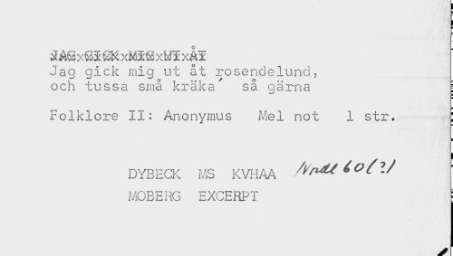 //// g AS xS ^ SK xMX S xM$ xå$ //// Jag gick mig ut åt rosendelund, //// och tussa små kräka' så gärna ! //// ! //// ' //// H //// Folklore II: Anonymus Mel not 1 str. //// a //// ! //// i //// DYBECK MS KVHAA //// MOBERG EXCERPI : ////