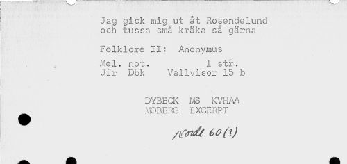 //// t //// Jag gick mig ut åt Rosendelund //// och tussa små kräka så gärna //// Folklore II: Anonymus //// Mel. not. 1 str. //// Jfr Dhk Vallvisor 15 b //// i < //// DYBECK MS KVHAA //// ^ MOBERG EXCERPT ////