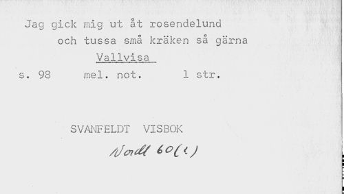 //// Jag gick mig ut åt rosendelund //// och tussa små kräken så gärna //// Vallvisa //// s. 98 mel. not. 1 str. //// SVANFELDT VISBOK ////