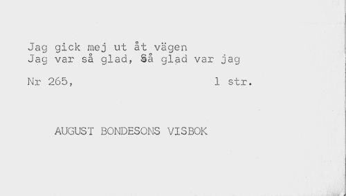 //// Jag gick mej ut åt vägen //// Jag var så glad. Så glad var jag //// Nr 265, 1 str. //// AUGUST BONDESONS VISBOK //// - j ////