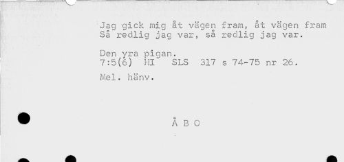 //// Jag gick mig åt vägen fram, åt vägen fram //// Så redlig jag var, så redlig jag var. //// Den yra pigan. //// 7:5(6) Hl SLS 317 s 74-75 nr 26. //// Mel. hänv. ////